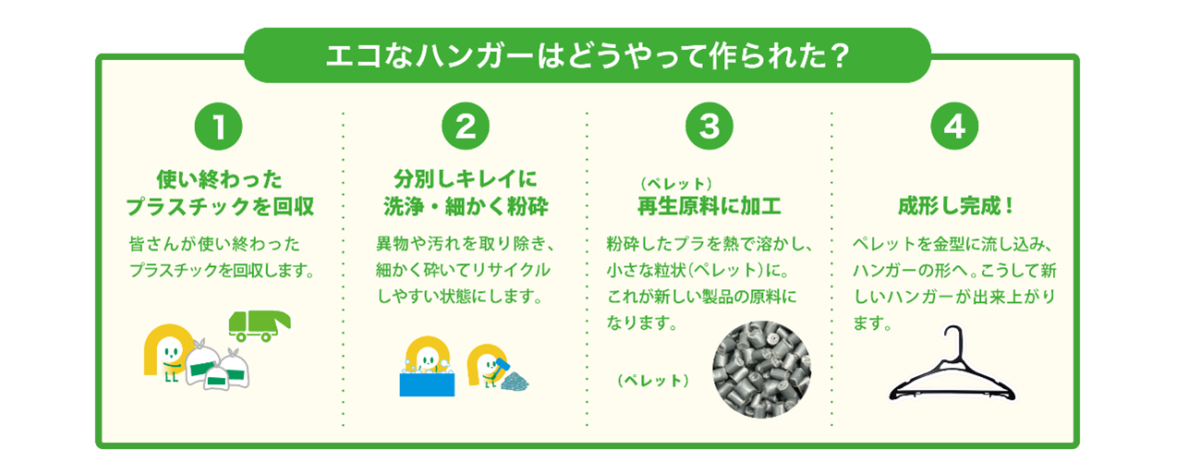 「エコなハンガー」は回収されたプラスチックを分別し洗浄・粉砕され、再生原料に加工した後に成形し完成。市民から提供された資源を活用した地域発の再生商品で、全世代へリサイクルの成果を見えるかたちで提供し、環境配慮型商品として次世代に向けて持続可能な価値を創出しているのが特徴です。