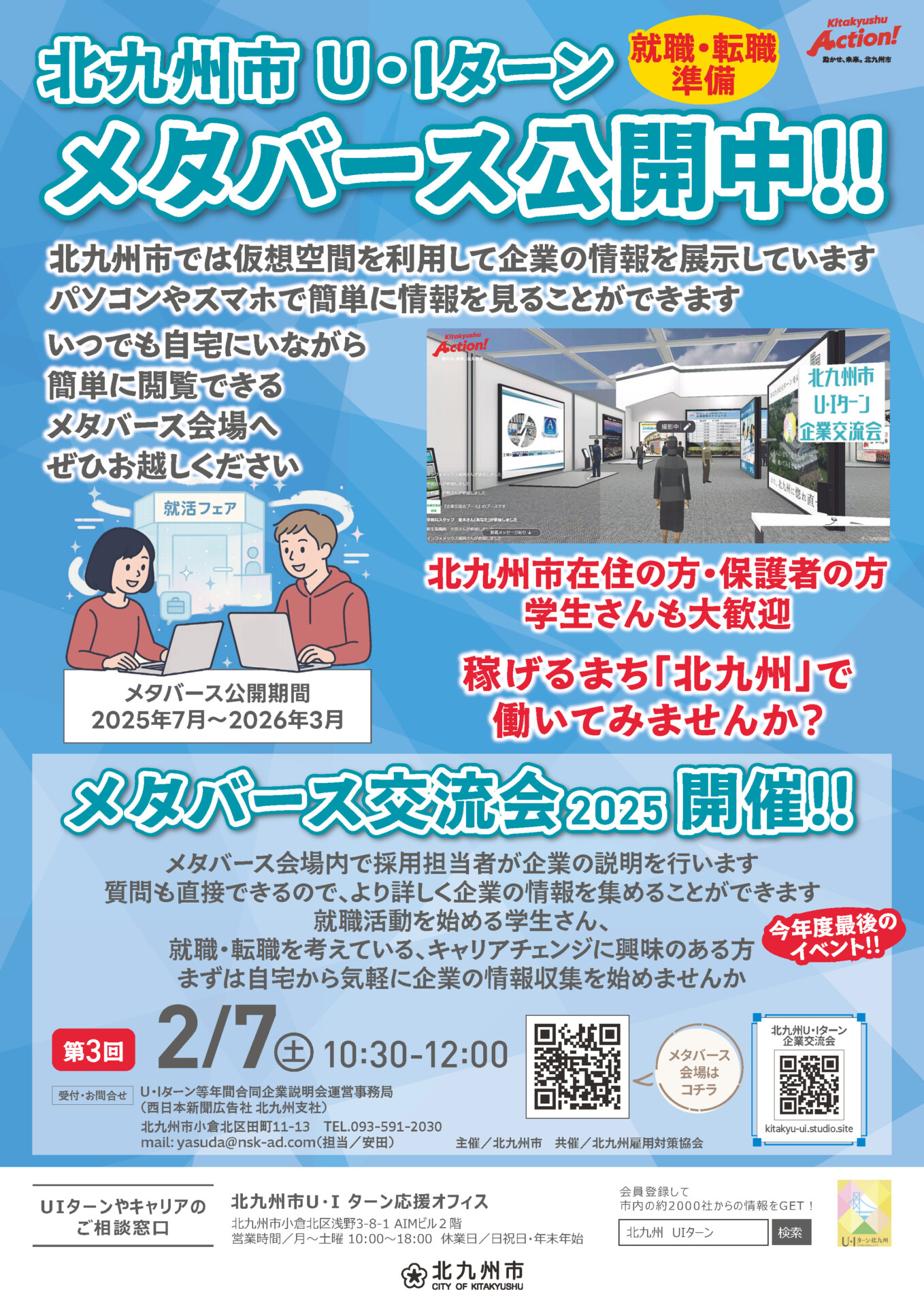 北九州市では2月7日(土)、U・Iターン向けのオンライン企業説明会を開催します。就職活動を始めた学生や就職・転職を検討している人に向けて、自宅から気軽に参加できるオンライン説明会です。