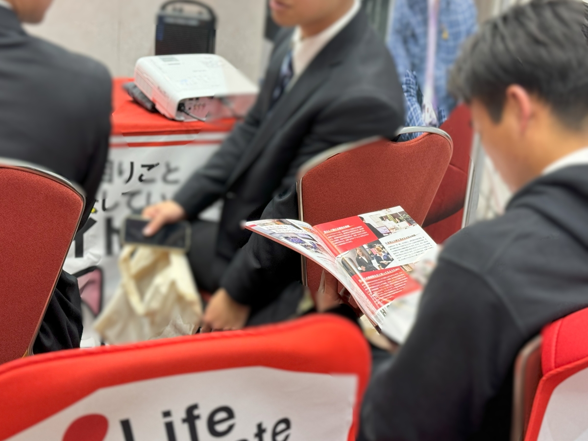 当日のライフクリエイトのブースには、同社に興味を持った学生が次々に着席。学生たちは、少し緊張した様子で説明会の開始を待ちます。