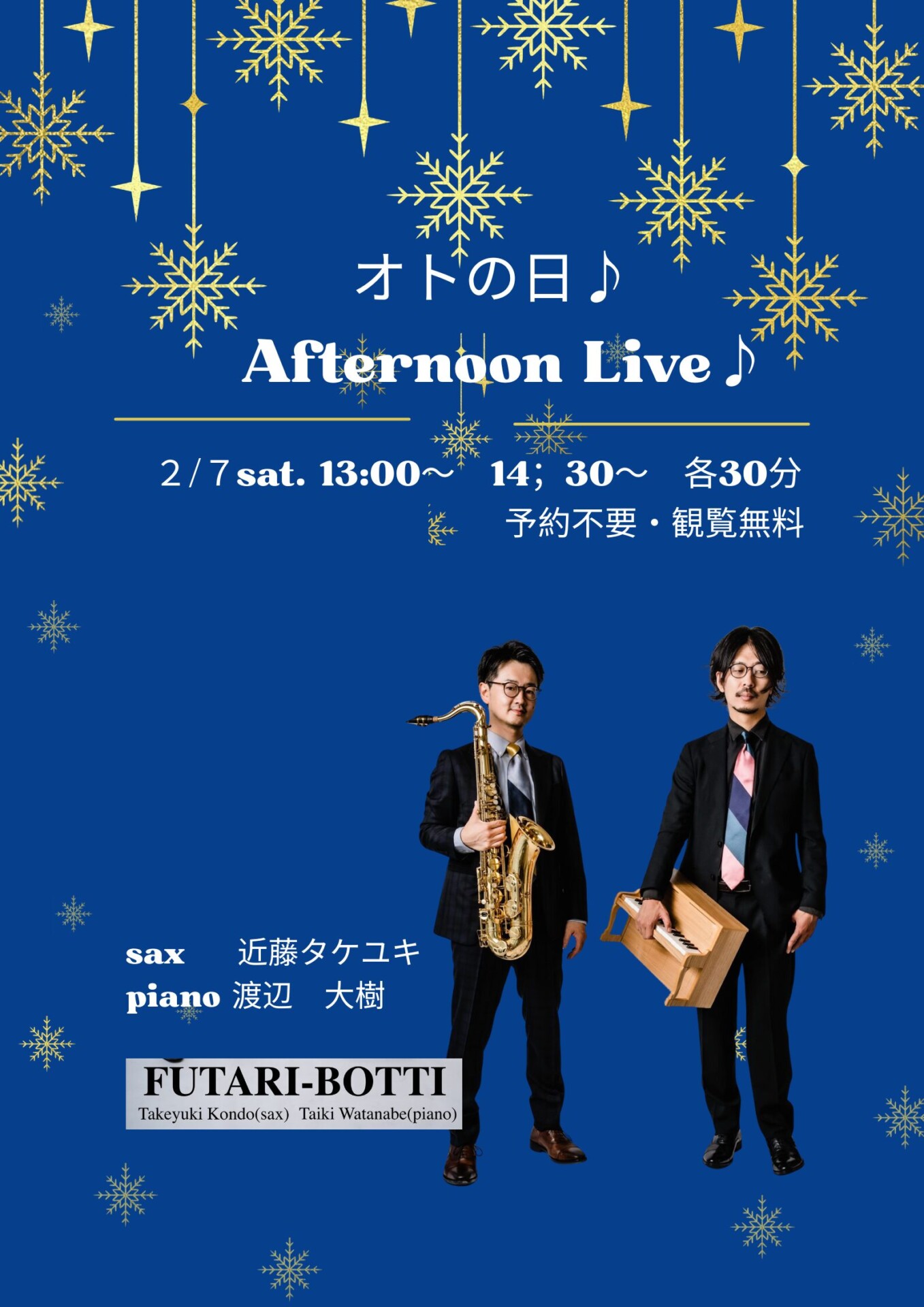 2月の「オトの日」は、<フタリボッティ>のサックスとピアノのデュオをお届けします。サックス奏者「近藤タケユキ」とピアニスト「渡辺大樹」によるデュオユニットです。ジャズスタンダードからポップスのアレンジ、オリジナル曲をレパートリーに楽しいコンサートをお届けします。