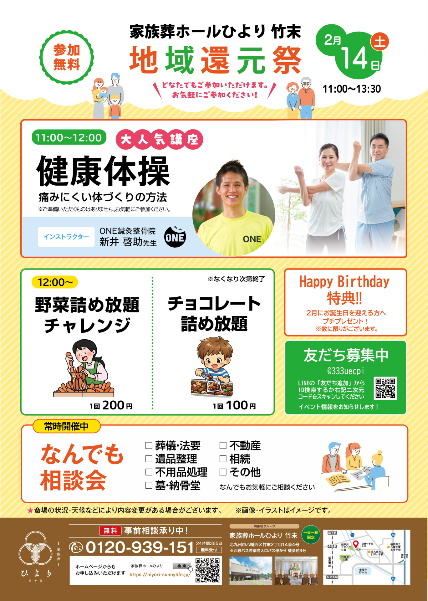 2月14日(土)11:00~13:30、家族葬ホールひより 竹末にて「地域還元祭」を開催いたします!