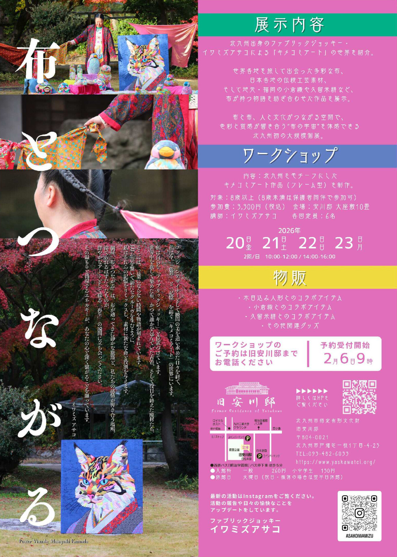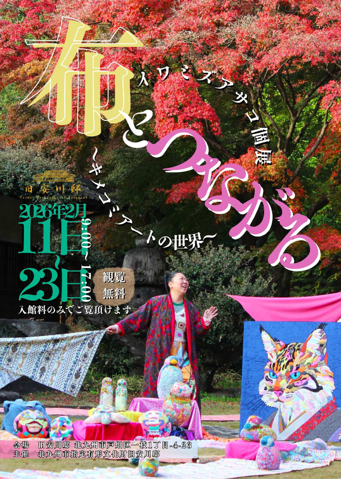 この度、イワミズアサコ氏による、伝統と革新が鮮烈に交差する作品展を開催します。築110年超の静謐な日本家屋に、時を超えて巡り会った世界中のテキスタイルや、地元の「小倉織」「久留米絣」などを大胆にリミックスした動物オブジェや平面作品など、約50点が一堂に集結。歴史の重みとポップな色彩が響き合う、時空を超えた「布のセッション」です。見る者の感性を揺さぶるかつてない空間美をお楽しみ下さい。