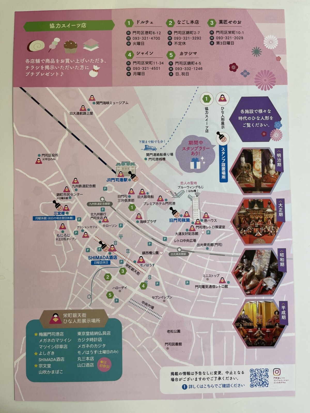 また、協力スイーツ店では、「門司港レトロひな祭り」のチラシを提示して買い物をすると、プチプレゼントも用意。対象は、ドルチェ・なごし本店・菓匠せのお・シャイン・カワシマの5店舗です。