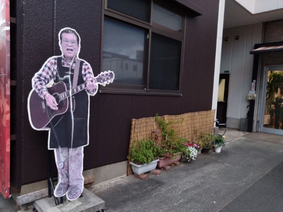 駐車場を奥へ進むと、等身大パネルのようなものを発見。このパネルの主は、歌とギターをこよなく愛する店主の山形公規(きみのり)さんです。