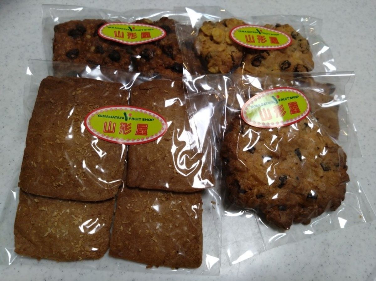 写真は左上から時計回りに「オートミールクッキー」、「コーンマカロン」、「全粒粉クッキー」、「オートミール&チョコチップクッキー」