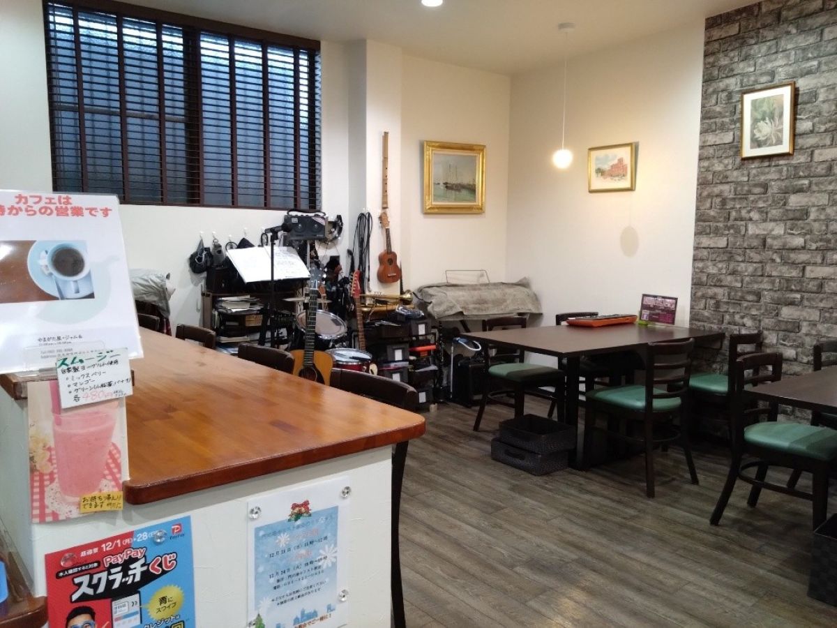 店内の半分は、カフェスペースになっています。カフェの奥には楽器があり、時折ミニコンサートが開催されるそうです。