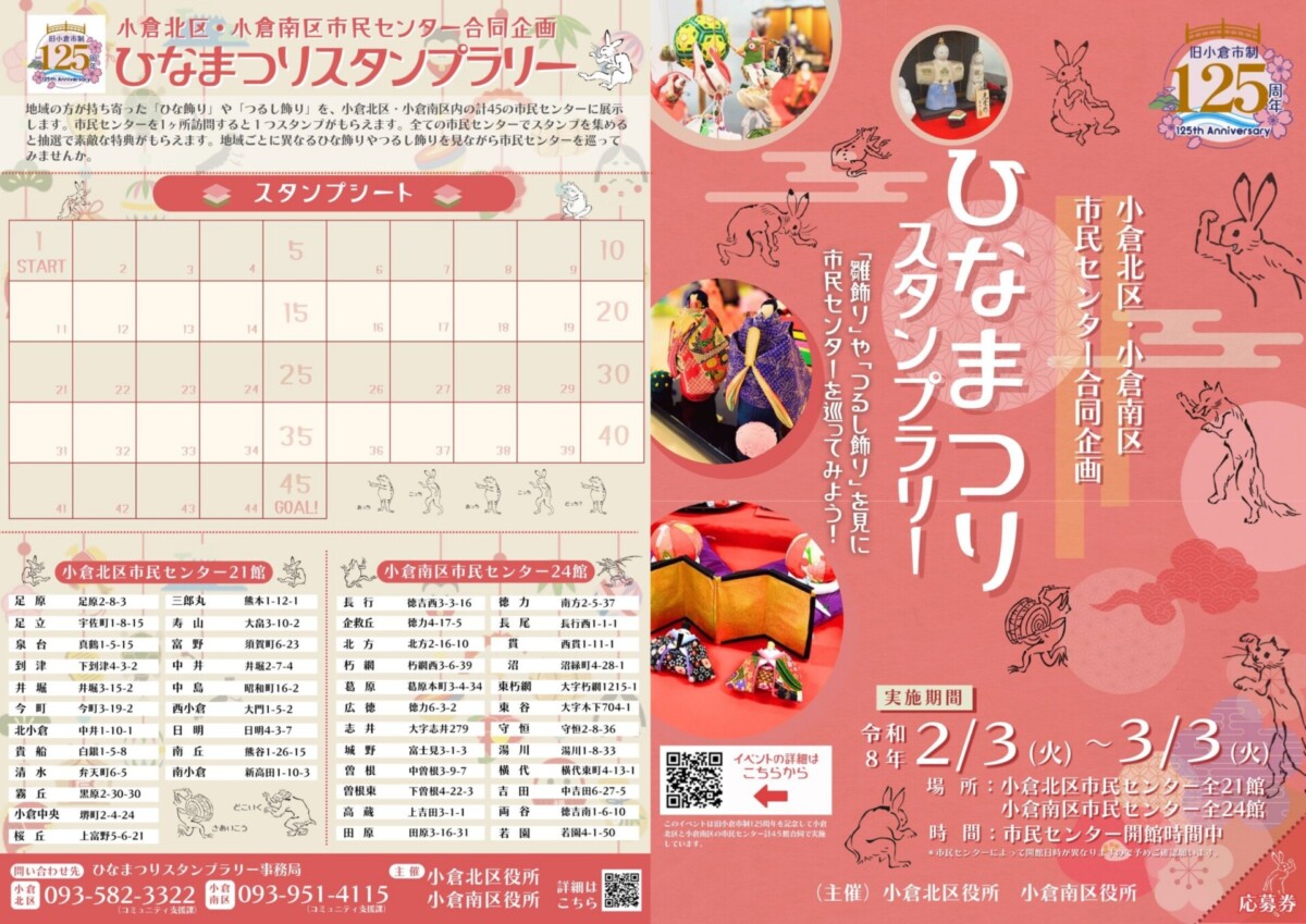 「ひなまつりスタンプラリー」は、旧小倉市制125周年を記念して小倉北区と小倉南区が合同で実施。小倉北区と小倉南区の市民センターを巡り、ひな飾りつるし飾りなどを楽しみながらスタンプを集めます。