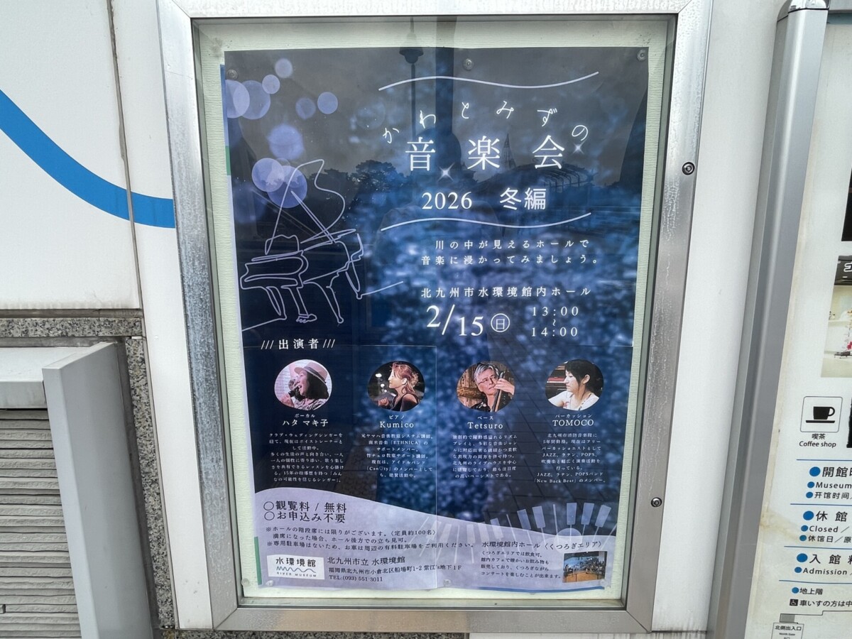 水環境館(北九州市小倉北区船場町1-2 )の館内ホールで2月15日、「川と水の音楽会2026<冬編>」が開催されます。