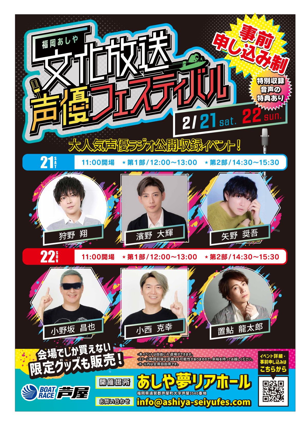 あしや夢リアホール(福岡県遠賀郡芦屋町大字芦屋3540番地)で2月21日(土)・22日(日)、人気声優が出演するラジオ公開収録イベント「福岡あしや 文化放送声優フェス」が開催されます。
