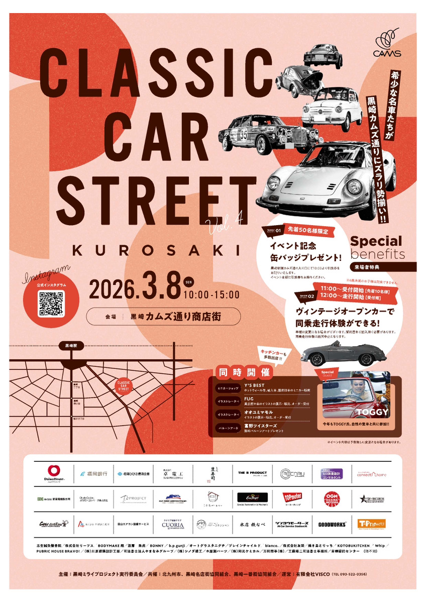 ヴィンテージカーの展示を通して黒崎の街の活性化を目的とするイベント<CLASSIC CAR STREET KUROSAKI Vol.4>を開催します。カムズ通り商店街に約45台のヴィンテージカーが展示され、スペシャルゲストのTOGGY氏による展示車両の紹介やミニカーショップ、アート作品の販売もございます。ぜひお越しください!