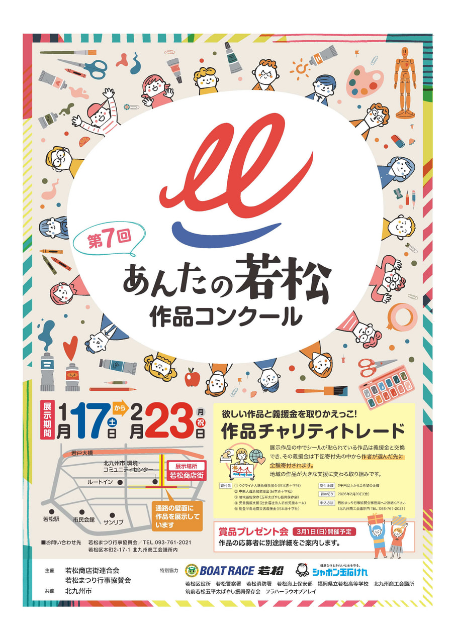 「あんたの若松作品コンクール」では、若松をテーマに応募のあった作品約730点を若松商店街に展示。老若男女さまざまな人が描く“若松”を見ることができる機会となっています。