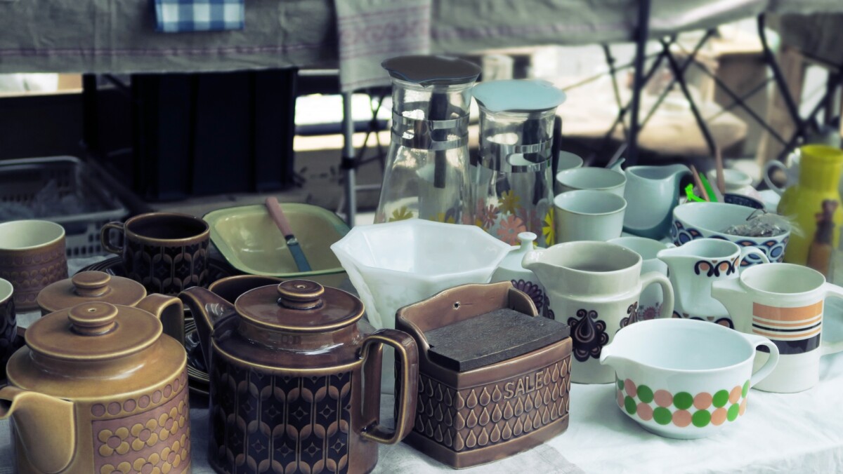 「門司港蚤の市」では、和・洋骨董を始め、陶器や着物、おもちゃやレトロ雑貨など長く大切にされてきた品々が並びます。