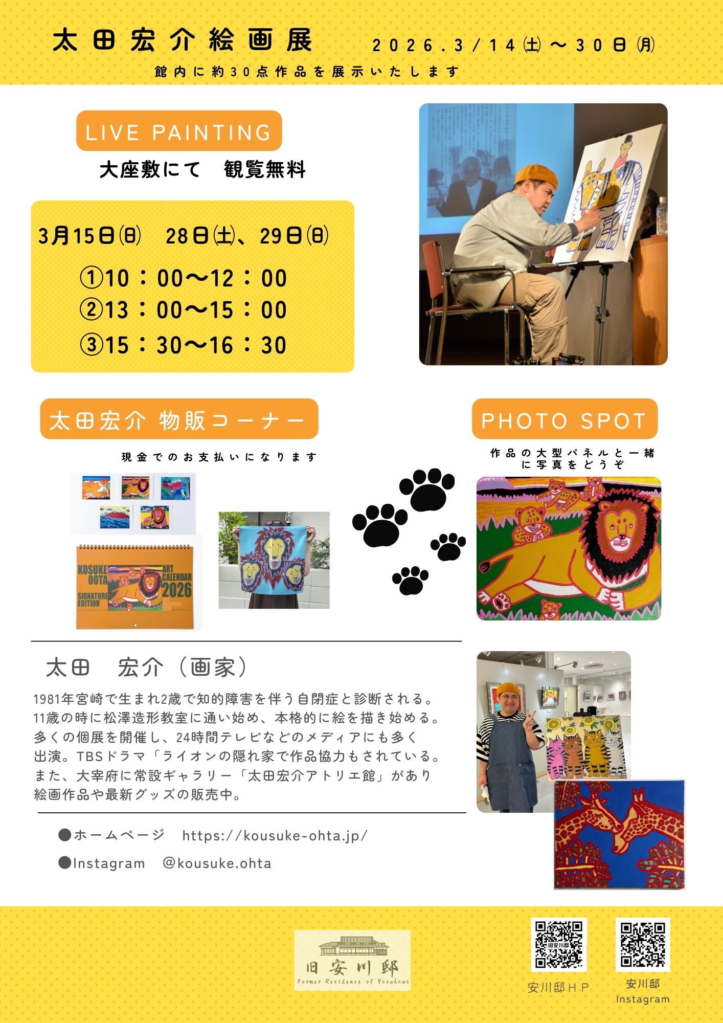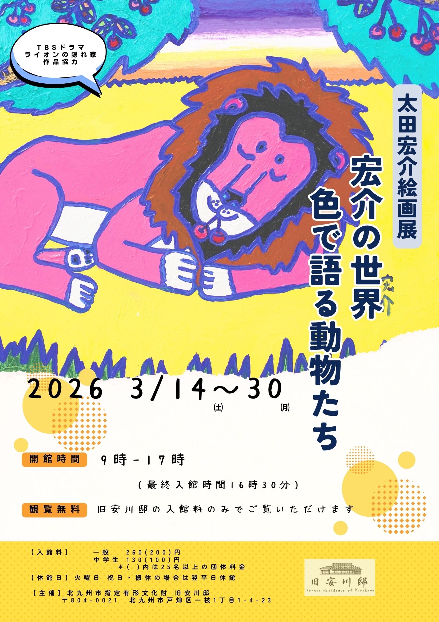 この春、旧安川邸の大座敷が楽しい動物たちの絵画で賑やかになります。昨年放送されたTBS金曜ドラマ「ライオンの隠れ家」に作画協力し、ますますファンを増やしている太田宏介さんの絵画を約20点展示。ドラマで使用された原画も展示します。