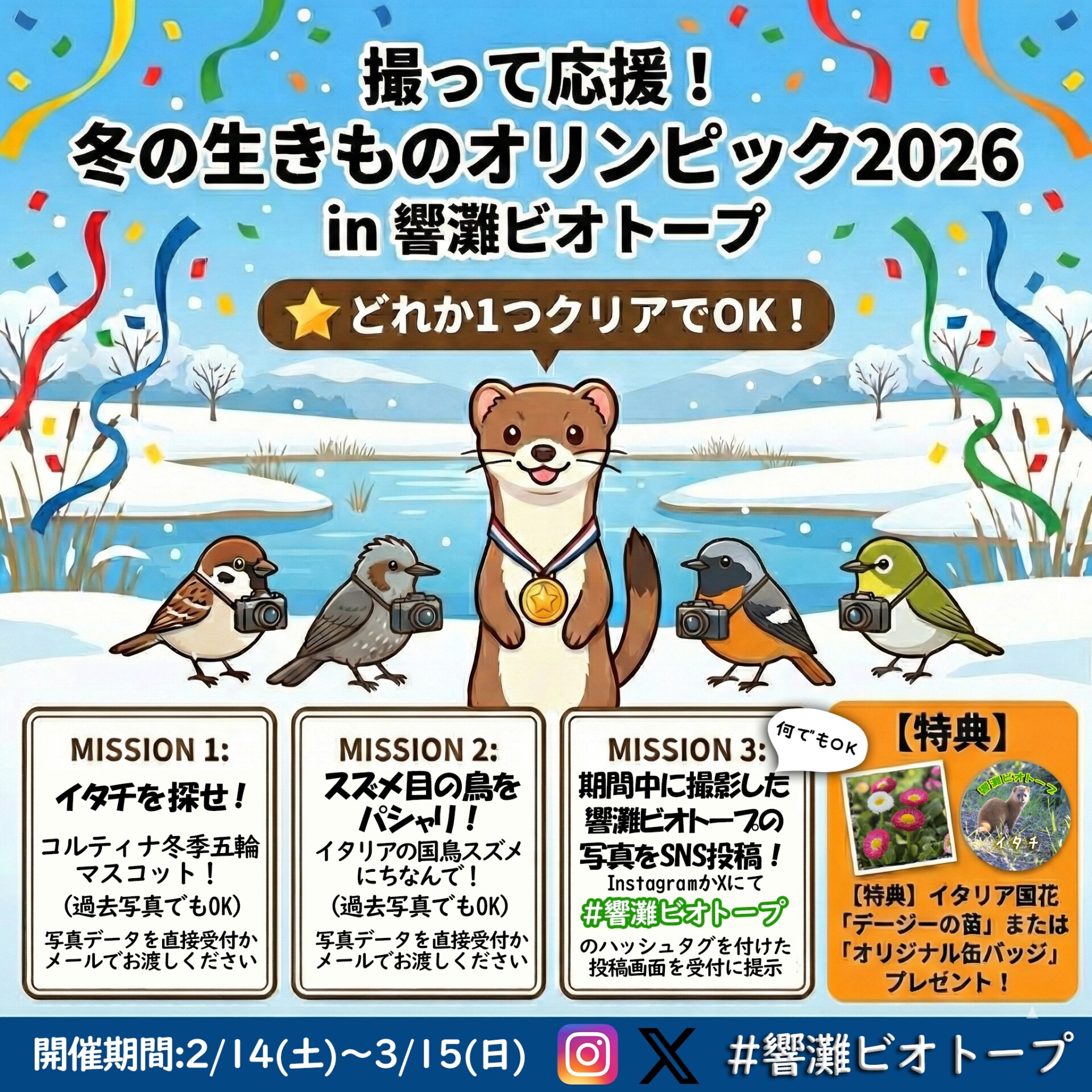響灘ビオトープで、冬季オリンピックの熱気に負けない楽しいイベント「冬の生きものオリンピック2026」を、3月15日(日)まで開催中です。今年の冬季五輪・パラリンピック開催地であるイタリアや、大会マスコットにちなんだ生きものをテーマにした参加型企画です。「本格的なカメラがないと難しそう」という方もご安心ください。スマホで撮影した写真や、過去に撮影して保存してある写真でも参加OK!散策のついでに、ぜひチャレンジしてみてください。
