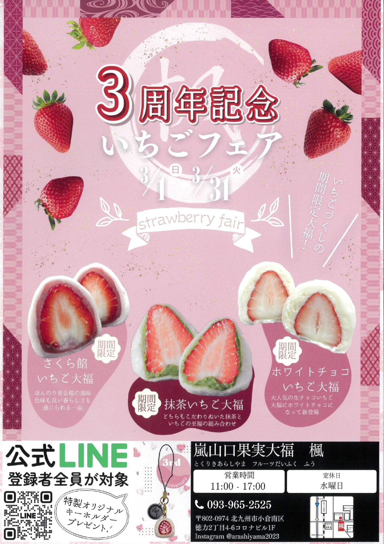 嵐山口果実大福 楓もオープンから3年を迎えました。これもひとえに皆さまのおかげです。3周年期間中は、「白あんいちご」「こしあんいちご」のほか、「抹茶いちご」「ホワイトチョコいちご」「さくらあんいちご」など、いちごのメニューを増やしております。また感謝の気持ちを込めまして、LINE登録の方皆さまに手作りの<楓特製イチゴ大福キーホルダー>をプレゼントいたします!皆さまのご来店お待ちしております♪