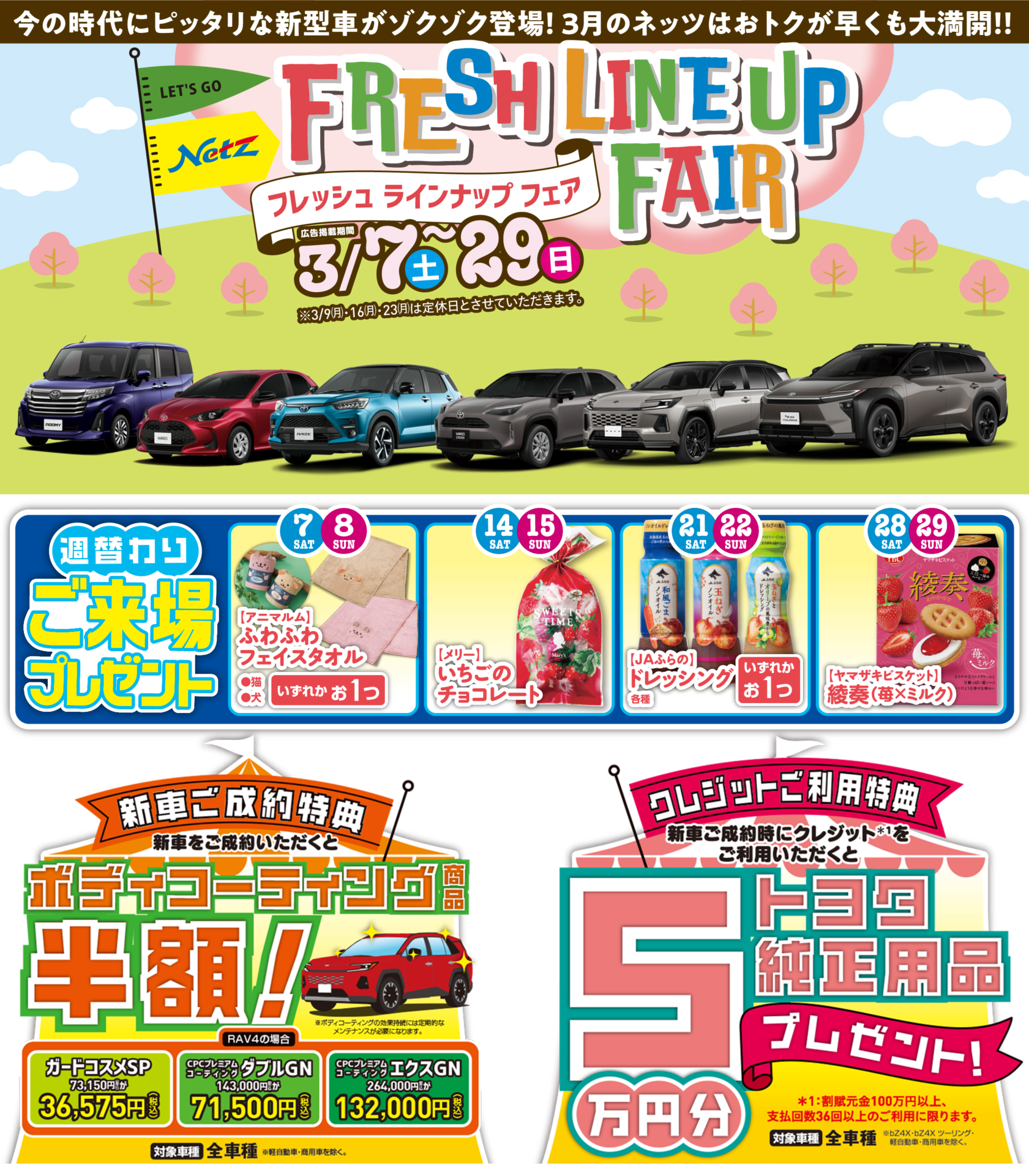 3月7日(土)~29日(日)まで!<フレッシュ ラインナップ フェア>を開催中です!春に向けて、クルマ選びも動き出す季節。3月のネッツは新しい出会いが充実しています。新車をご成約いただくと、ボディコーティング商品がなんと半額に!さらに、新車ご成約時にクレジットをご利用いただくと、トヨタ純正用品5万円分プレゼント!この春は、ネッツでぴったりの一台を見つけてください。