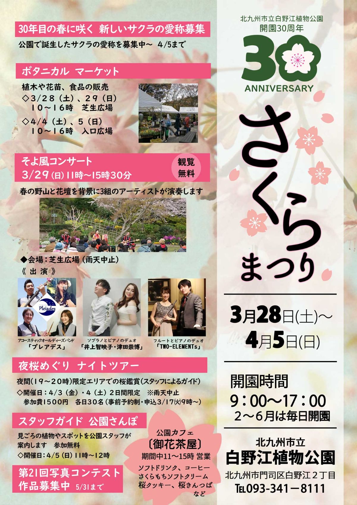 白野江植物公園(北九州市門司区白野江2丁目)で3月28日から4月5日の期間、開園30周年を記念したイベント「さくらまつり」が開催されます。