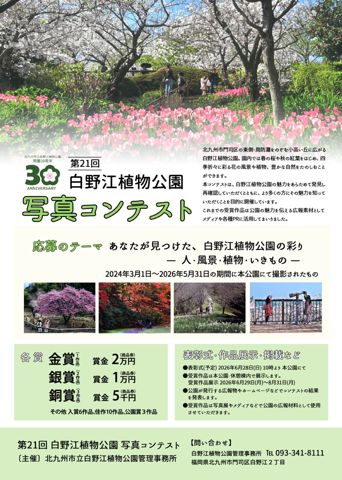 ■各賞/金賞(1作品)賞金2万円(商品券)、銀賞(2作品)賞金1万円(商品券)、銅賞(3作品)5000円(商品券)、入賞(6作品)、佳作(10作品)、公園賞(3作品)