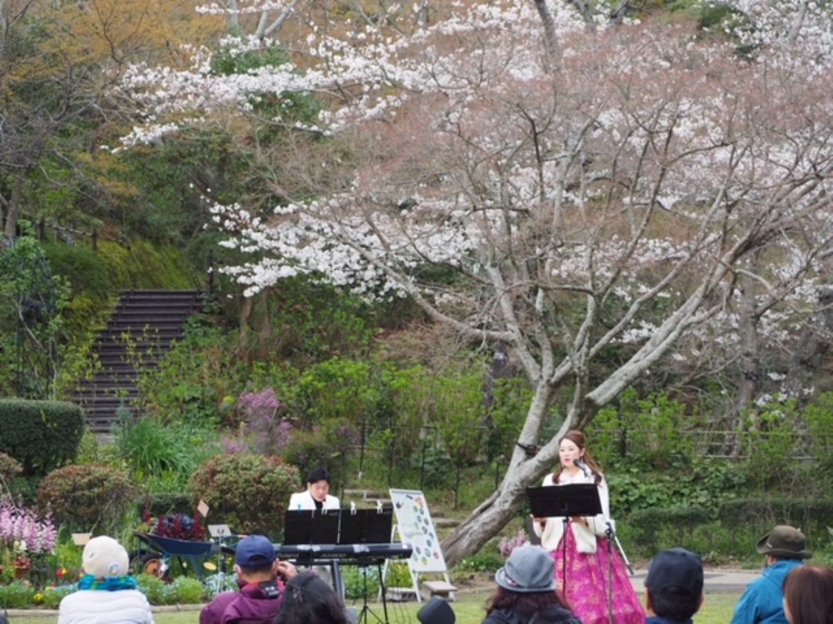 春の花壇と自然を背景に音楽演奏を楽しめる「そよ風コンサート」。芝生広場でアコースティックやピアノ・ソプラノデュオ、合唱団などが出演する音楽イベントが開催されます。