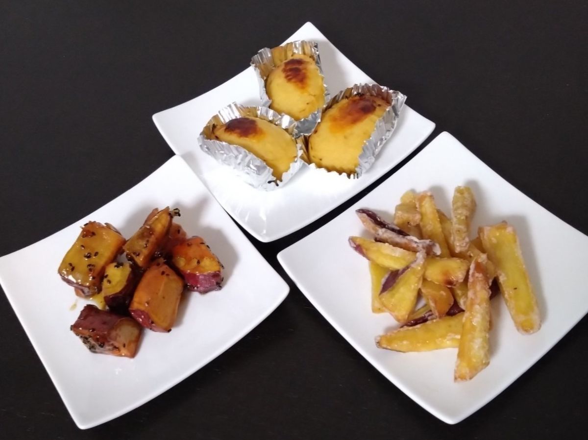 (左から)大学芋、スイートポテト、芋カリントウ/盛り付け例)芋伝説の芋かりんとうの特徴は、食感がホクホクだということ。冷めても固くならずに、塗した砂糖が残り、絶妙なバランスです。
