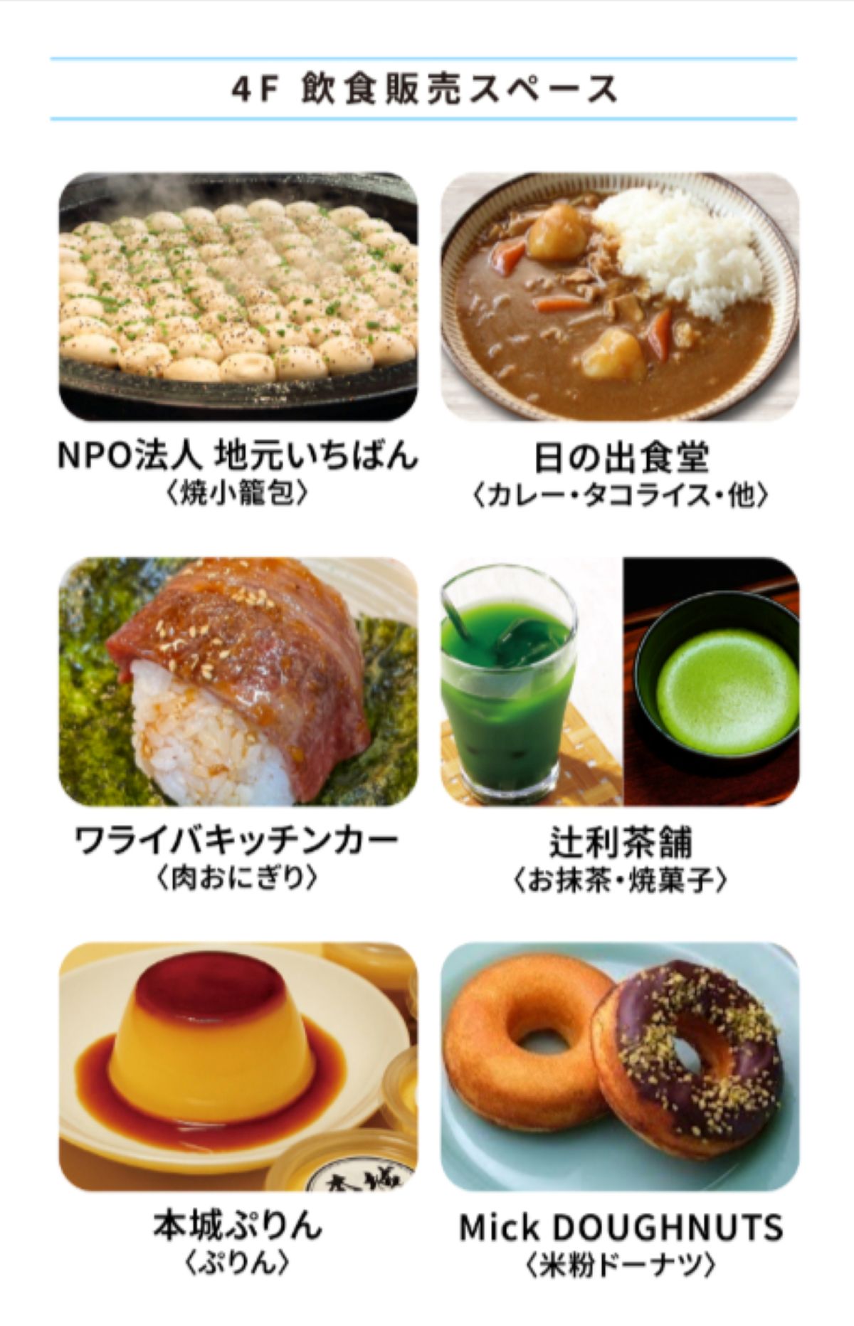 また4階の飲食スペースでは、焼小籠包やカレー、タコライス、肉おにぎりなどの食事系メニューに加え、抹茶スイーツやプリン、米粉ドーナツといったデザートも楽しめます。