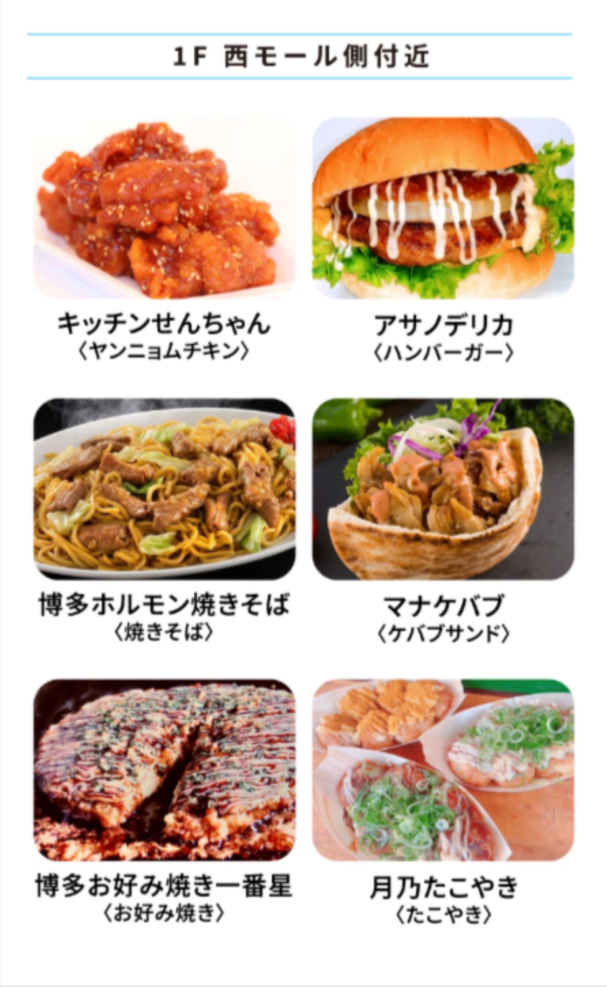 1階のキッチンカーエリアでは、ヤンニョムチキンやハンバーガー、ケバブサンド、焼きそば、お好み焼き、たこ焼きなど、食べ歩きにぴったりのメニューが勢ぞろい。