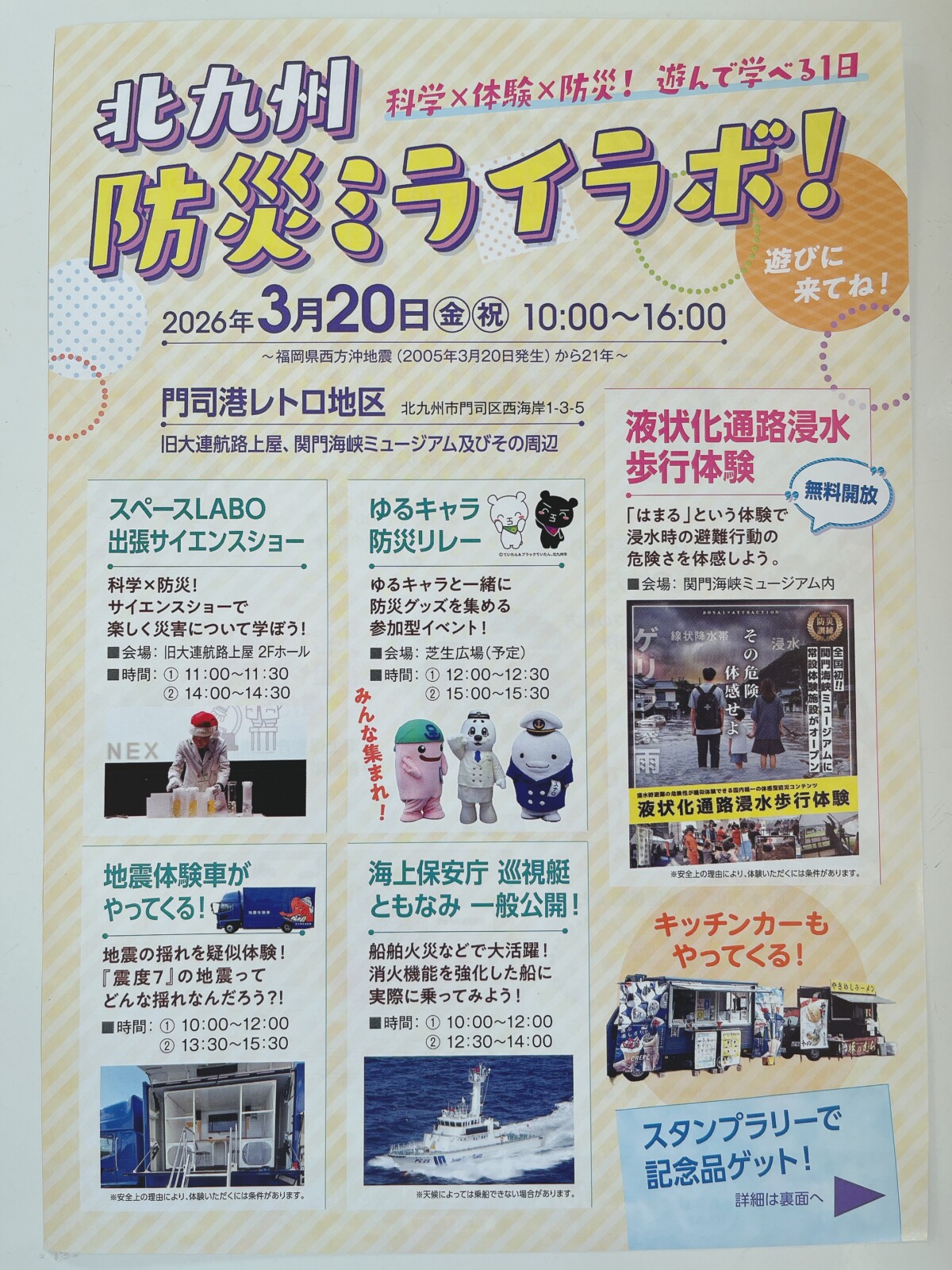 時間は午前10時〜午後4時で、会場は旧大連航路上屋と関門海峡ミュージアム及びその周辺。家族みんなで楽しみながら参加できる防災体験型イベントです。