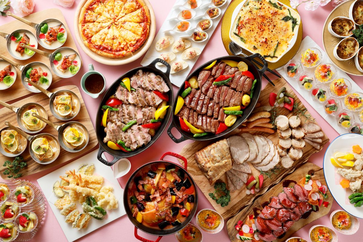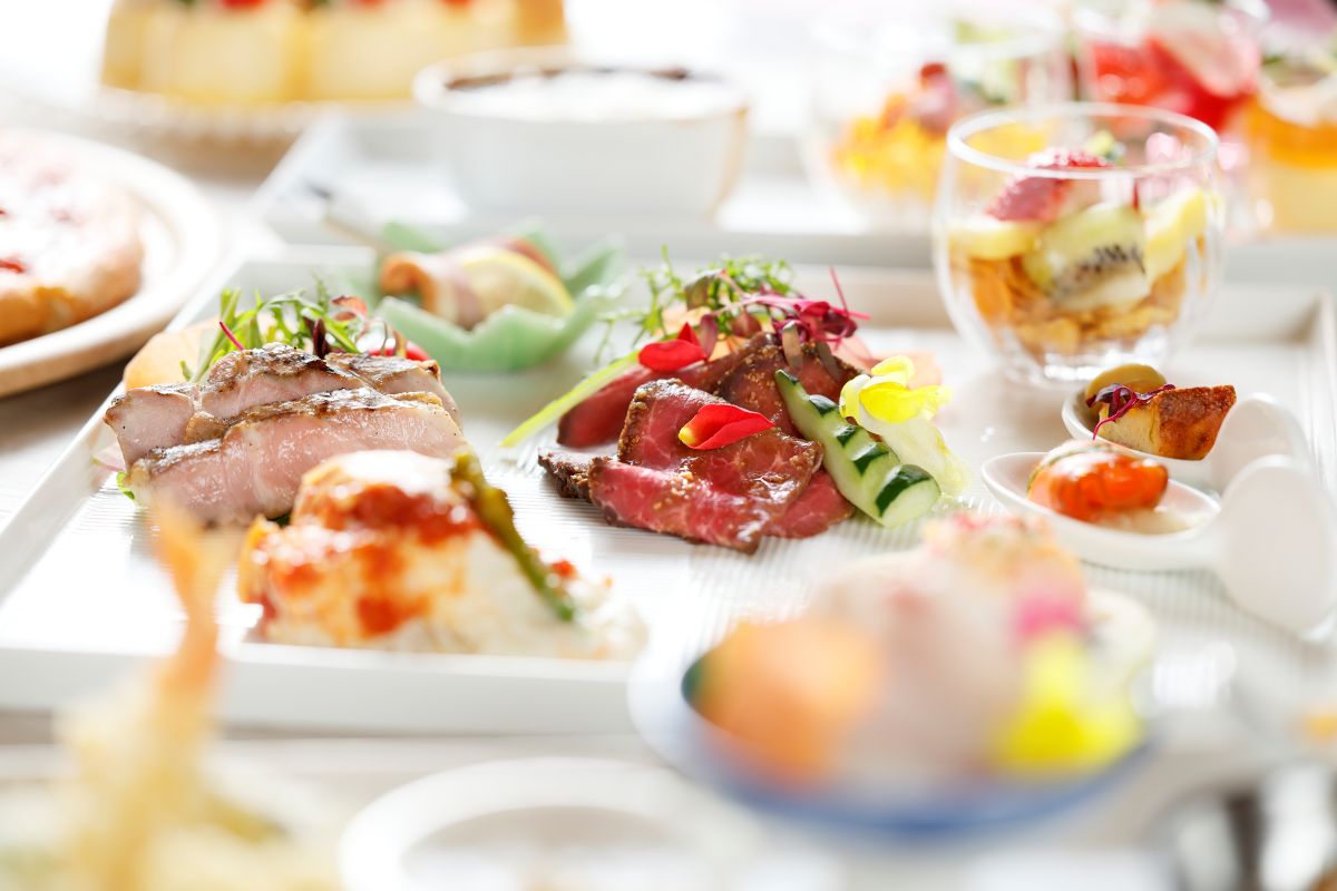和食・洋食を中心に、ライブキッチンで提供される出来立て料理や彩り豊かなデザートなど、多彩なメニューが楽しめる贅沢なランチタイムが魅力です。