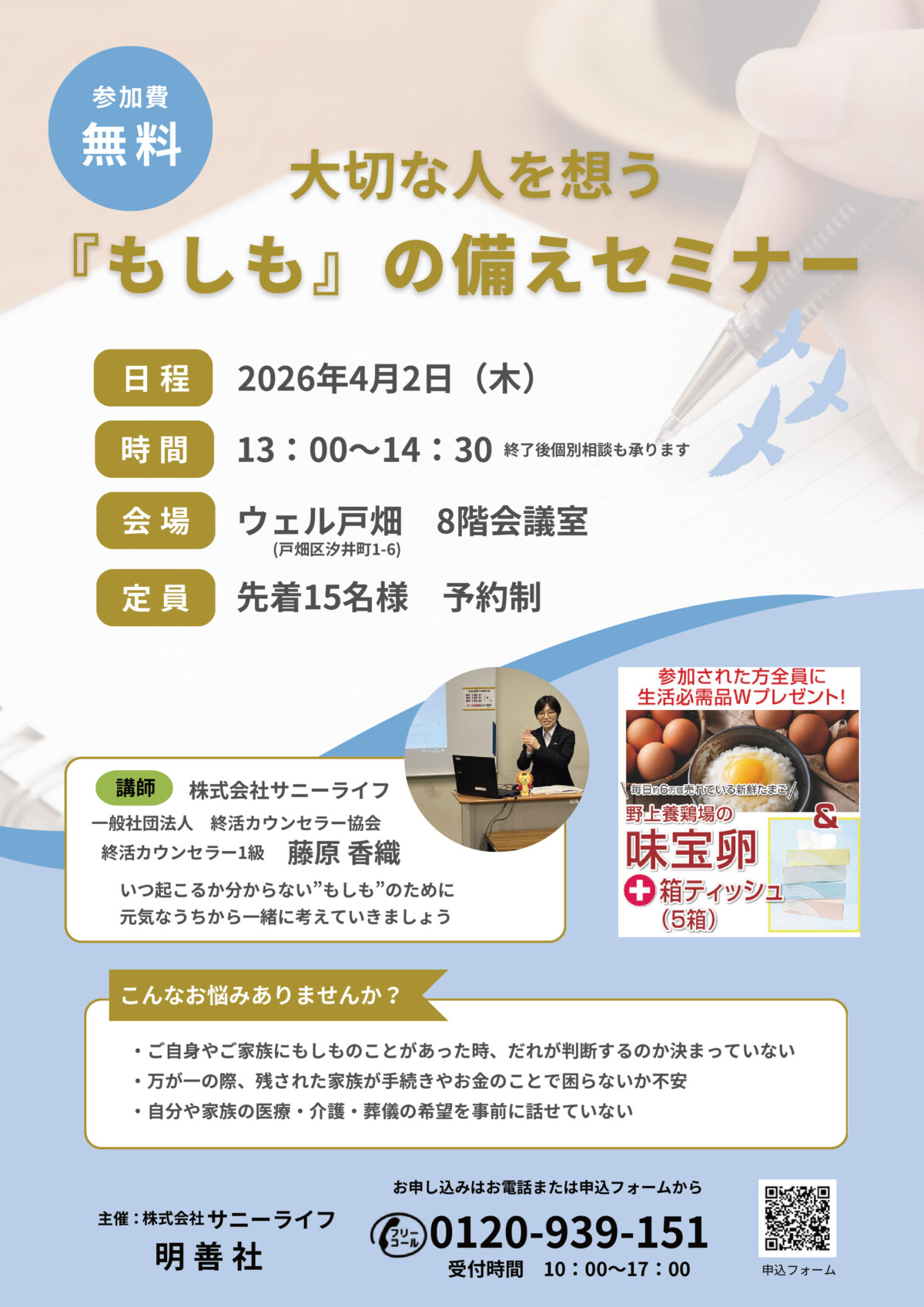 2026年4月2日(木)13:00~14:30、ウェル戸畑(戸畑区汐井町1-6)8階会議室にて<大切な人を想う『もしも』の備えセミナー(参加費無料!先着15名様 予約制)>を開催いたします!