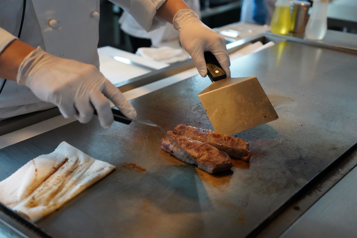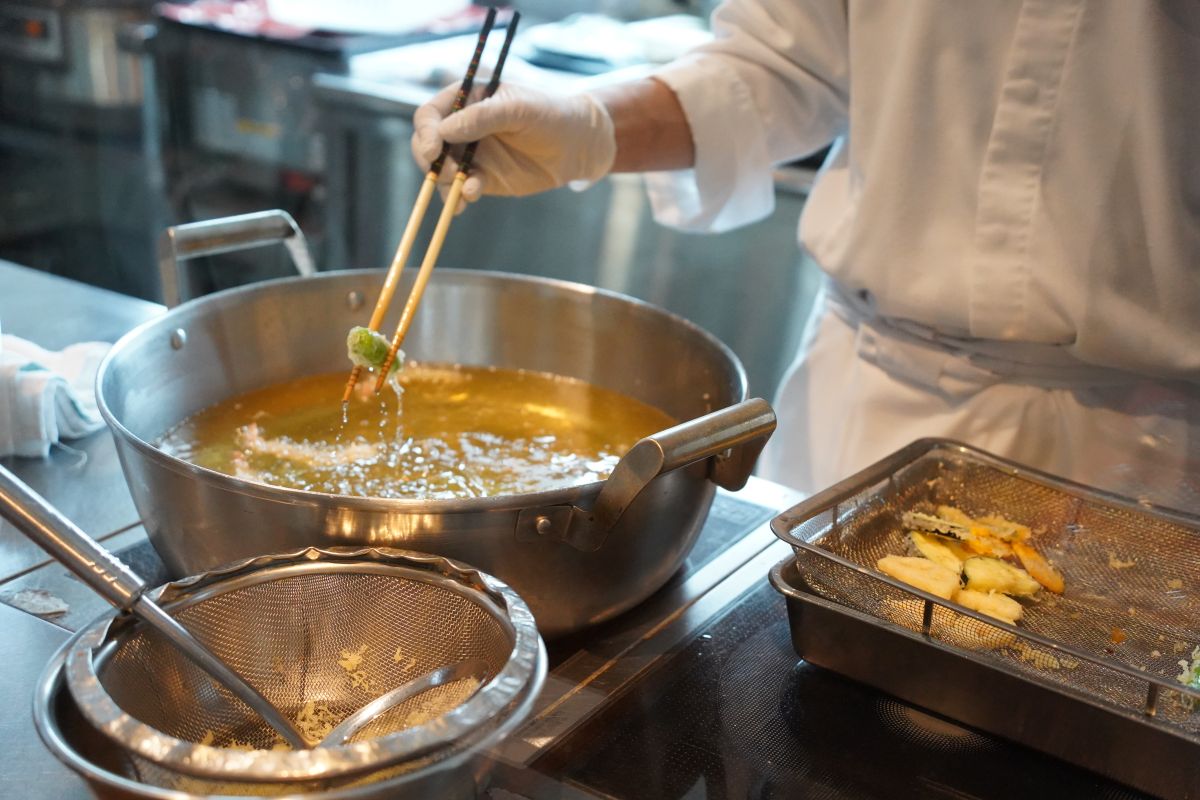 ライブキッチンでは、揚げたての天ぷらやステーキを提供。あつあつの料理を堪能することができます。