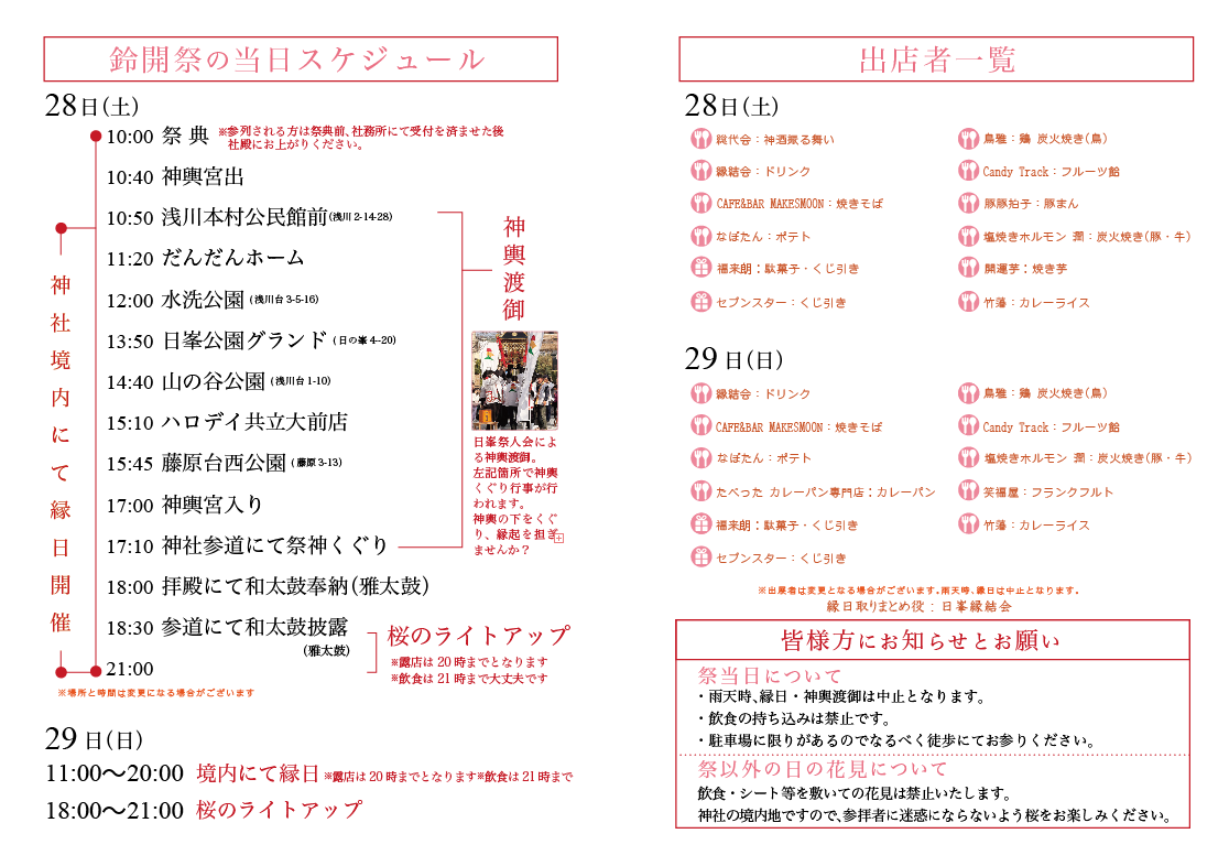 3月28日には、「神酒の振る舞い」や「神輿渡御」、初の試みとなる「和太鼓演奏の奉納」が行われます。