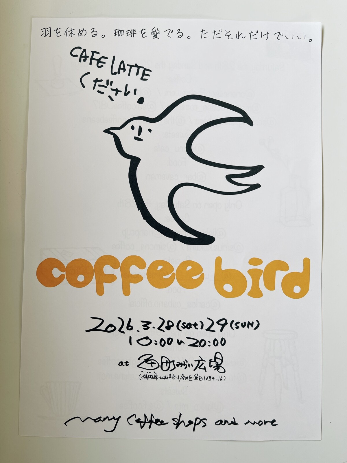 魚町みらい広場で3月28日と29日、さまざまなコーヒーショップが集まるイベント「coffee bird」が開催されます。