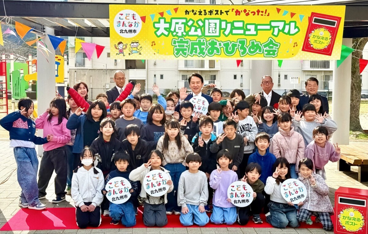 リニューアルオープンした3月13日には、大原公園で「お披露目会」を実施。大原小学校の3年生児童のほか、大原自治区会区会長、北九州市長、子ども家庭局長、八幡西区長らが出席しました。