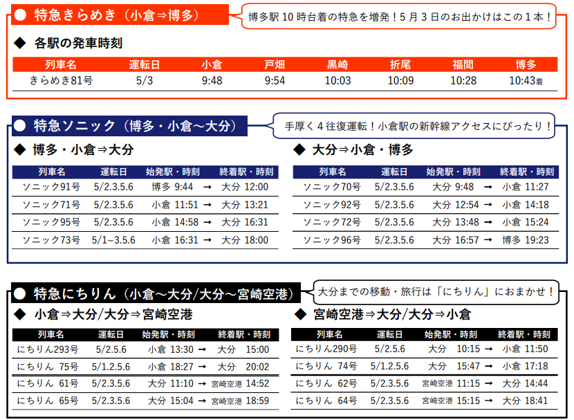 JR九州は利用者が多く見込まれるゴールデンウィーク(GW)期間に、特急きらめき号を1本、ソニック号を33本、にちりん号を30本それぞれ増発します。
