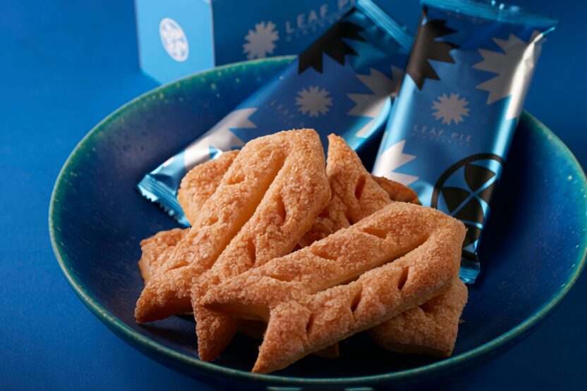「リーフパイ」は、厳選した小麦・北海道産バター・天然海塩を使用。81層の生地にバターを折り込み、ザラメを乗せてカリッと焼き上げています。