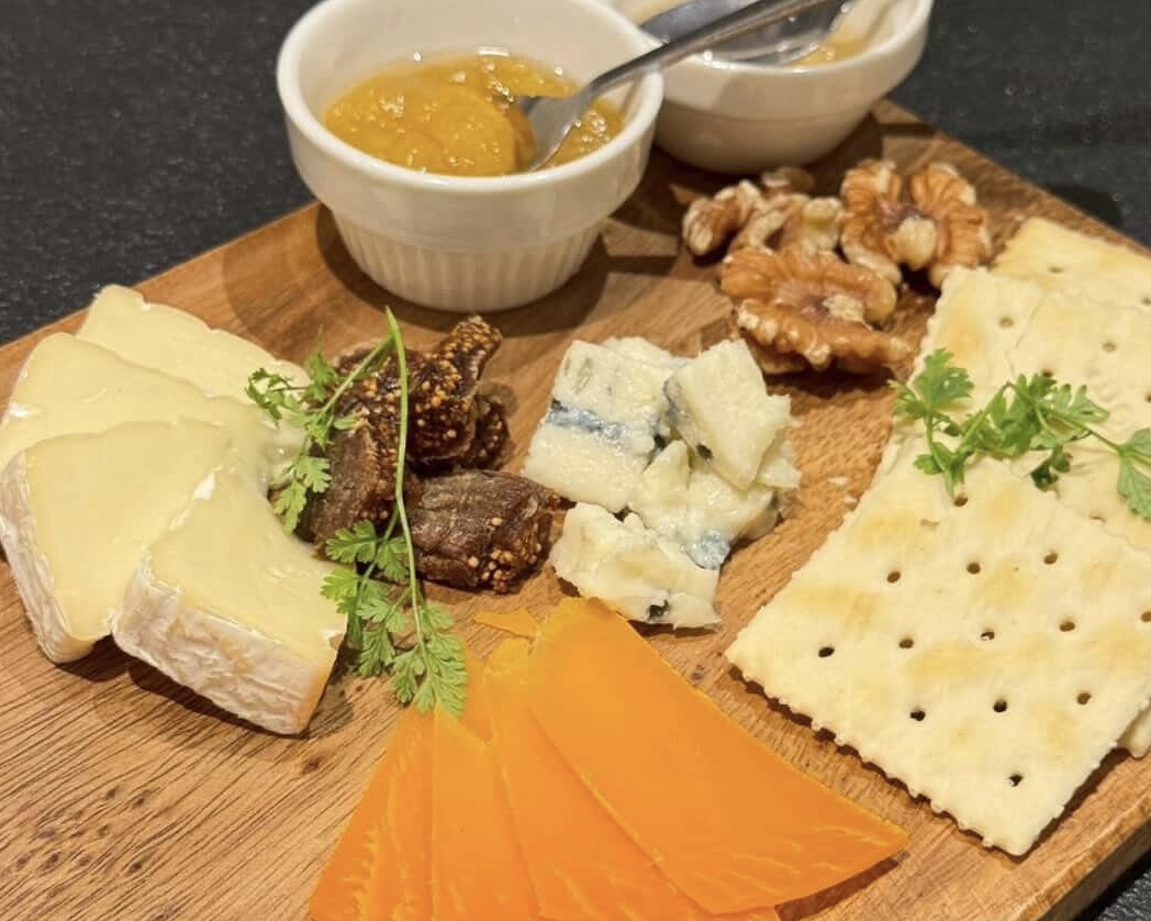特徴の違う3種類のチーズに、ドライフルーツ・蜂蜜・クラッカー・ジャム・くるみなどを添えて提供する「チーズ3種の盛り合わせ」。