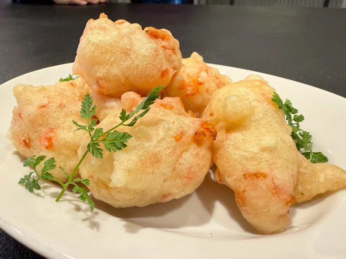 白ワインに合う「干しエビの揚げピザ」は、干しエビを練り込んだピザ生地を揚げて、外はカリッと中はふわっと仕上げています。