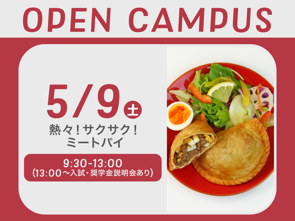 5月9日は「見て・聞いて・体験」できる充実の1日!北九州調理製菓専門学校のオープンキャンパスでは、学校の魅力を詳しく知ることができる学校説明会+実習体験を実施。実習体験はアツアツ&サクサクの<ミートパイ>作り体験です。さらに13時からは、入試や奨学金に関する説明会も開催。進路に関する疑問や不安をしっかり解消できます。