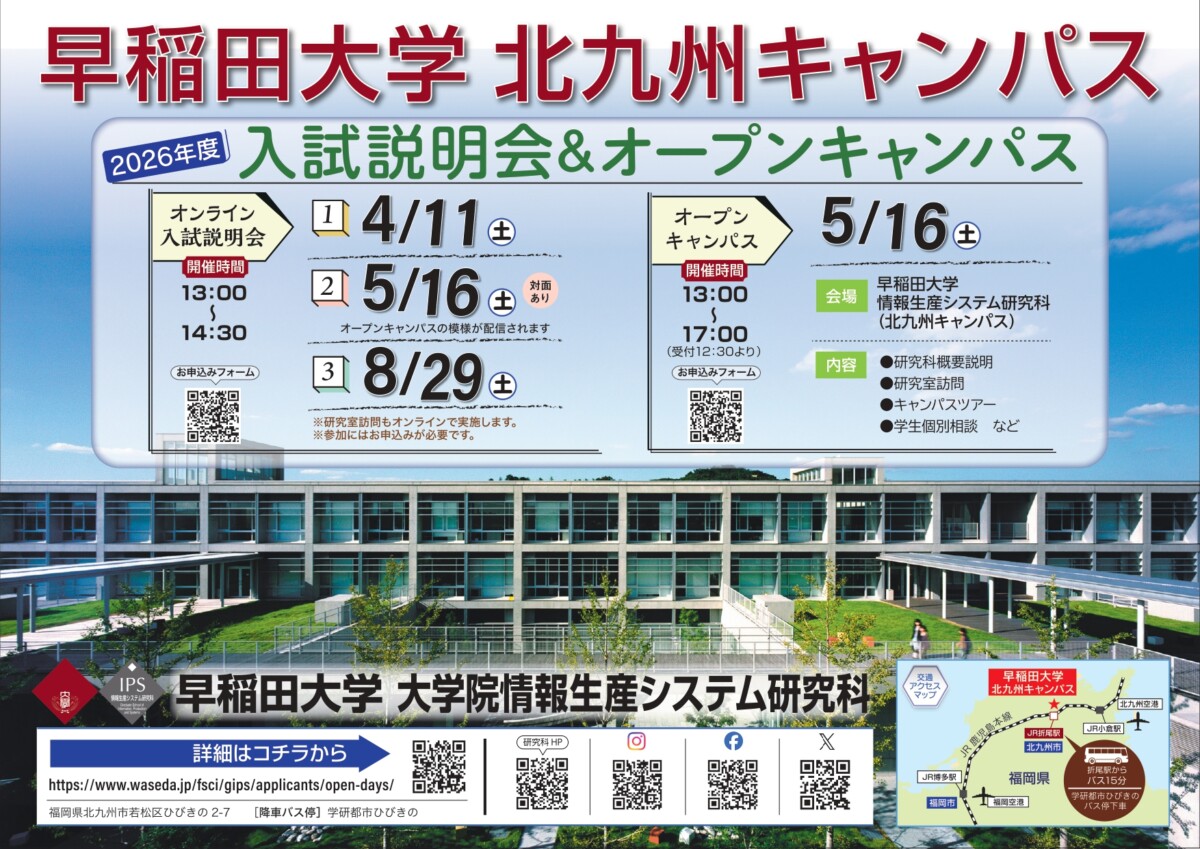 2026年5月16日(土)13:00~17:00、北九州学術研究都市にある早稲田大学 大学院情報生産システム研究科にてオープンキャンパスが開催されます。Webサイトから事前予約の上、どなたでも参加可能です。
