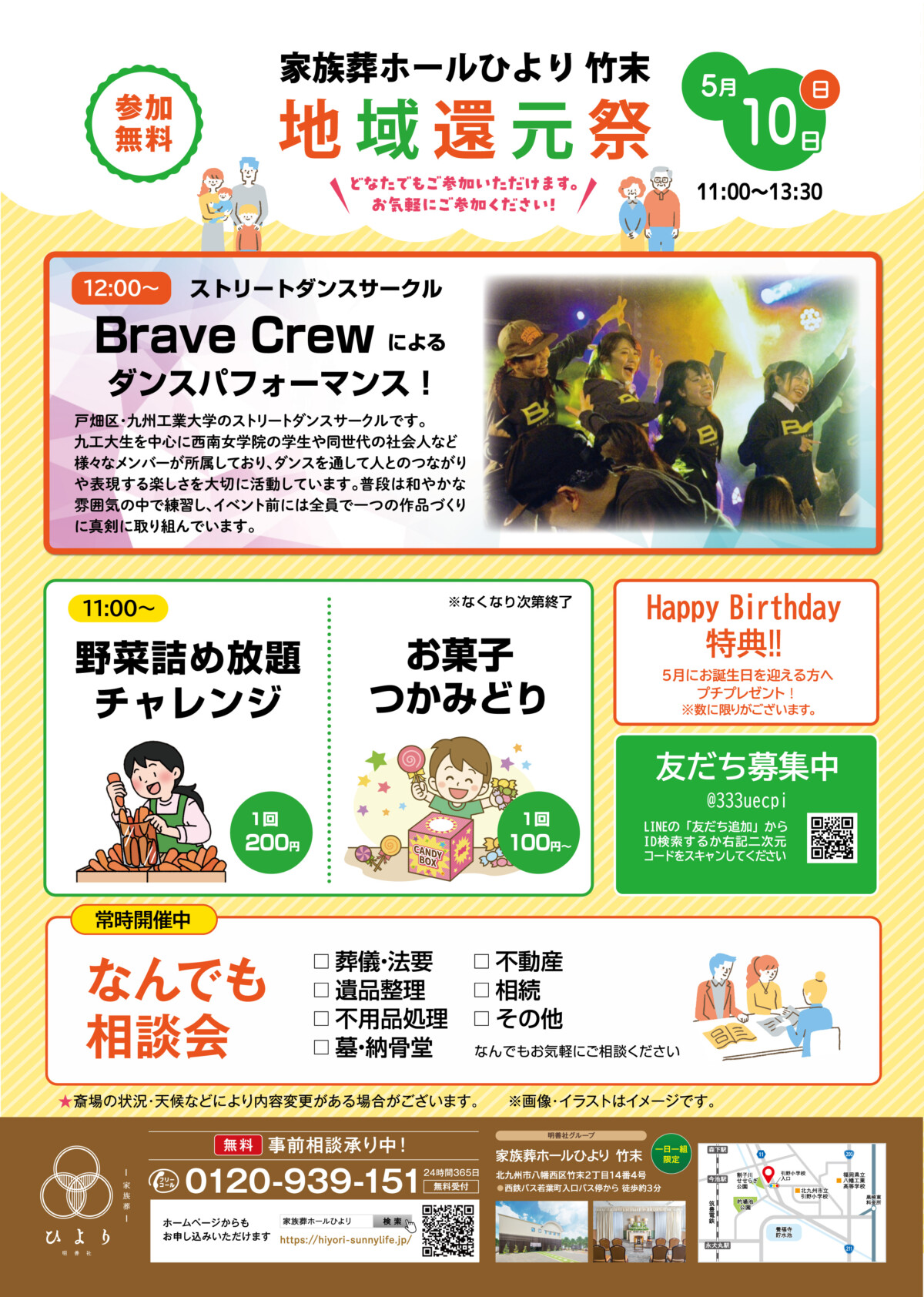 2026年5月10日(日)11:00~13:30、家族葬ホールひより 竹末にて「地域還元祭」を開催いたします!5月にお誕生日を迎える方へプチプレゼントもございますので、 ぜひお気軽にお越しください!