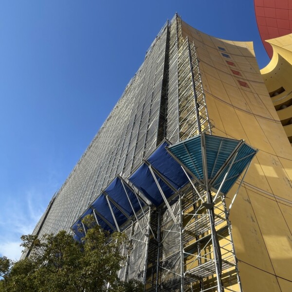 リバーウォーク北九州の駐車場が工事に伴い一部閉鎖 小倉城側の外壁を工...