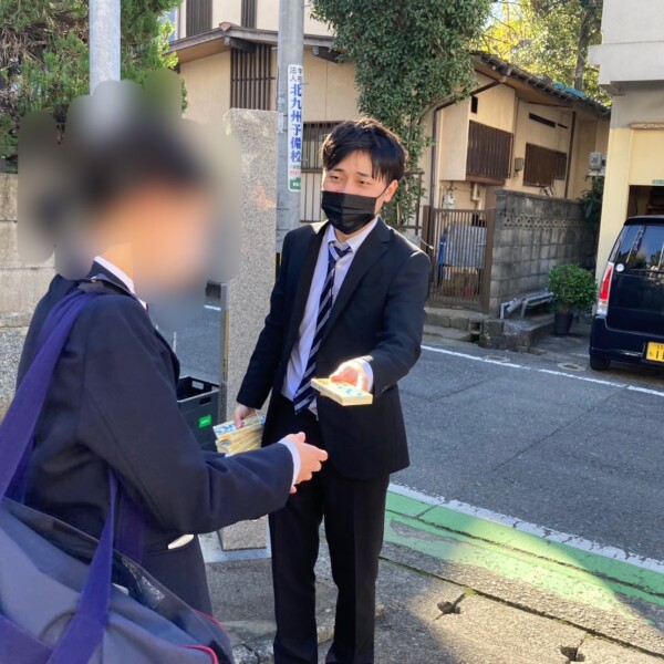 暑い時季に八幡西区折尾に登場した、折尾駅近くの高校に通う生徒たちを対象に「ジュース配り」をする人たち。 季節が変わり、今度は「チ...